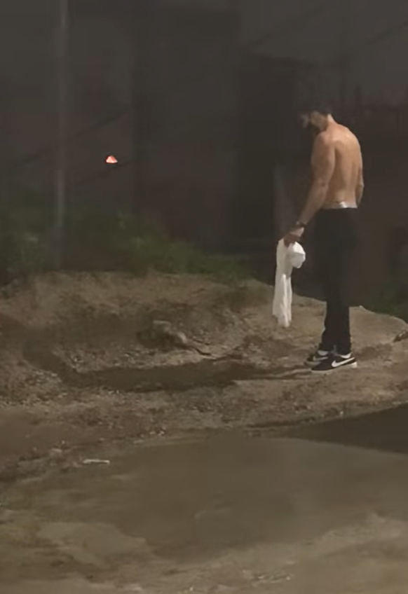 ▼Medina來到負鼠身邊,脫下上衣將牠包起來,然後將牠放到高處的土堆上。這裡相對來說比較安全,而且前方不遠處就是樹叢,負鼠恢復力氣後能夠自行回到熟悉的環境中。幸好負鼠沒有受傷,只是受了一點驚嚇而已。