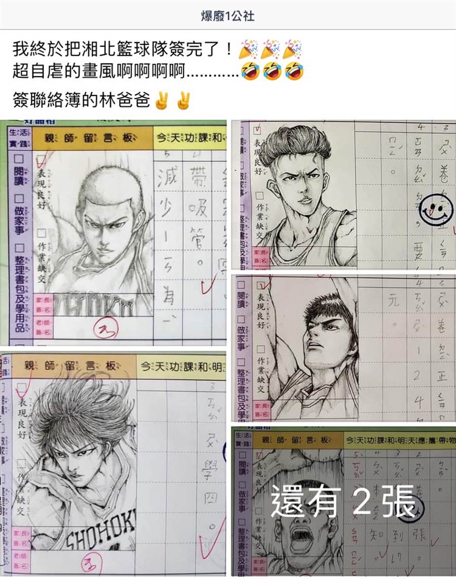 2020年10月30日現在的孩子每天都要寫家庭聯絡簿,學校會要求家長天天簽名,了解孩子在學校中的狀況。一位創意十足的老爸在聯絡簿上簽名後,竟然開始畫畫。他在親師留言版畫超細緻的動漫角色,最近還在臉書社團「爆廢1公社」po文說:「我終於把湘北籃球隊簽完了!」