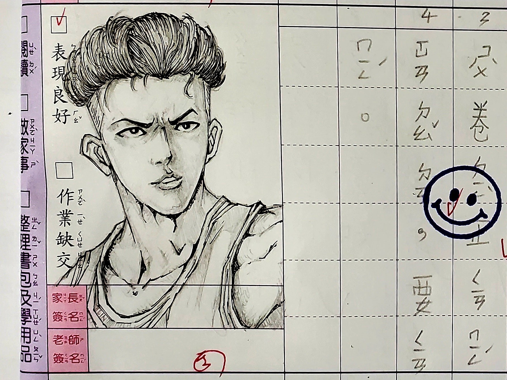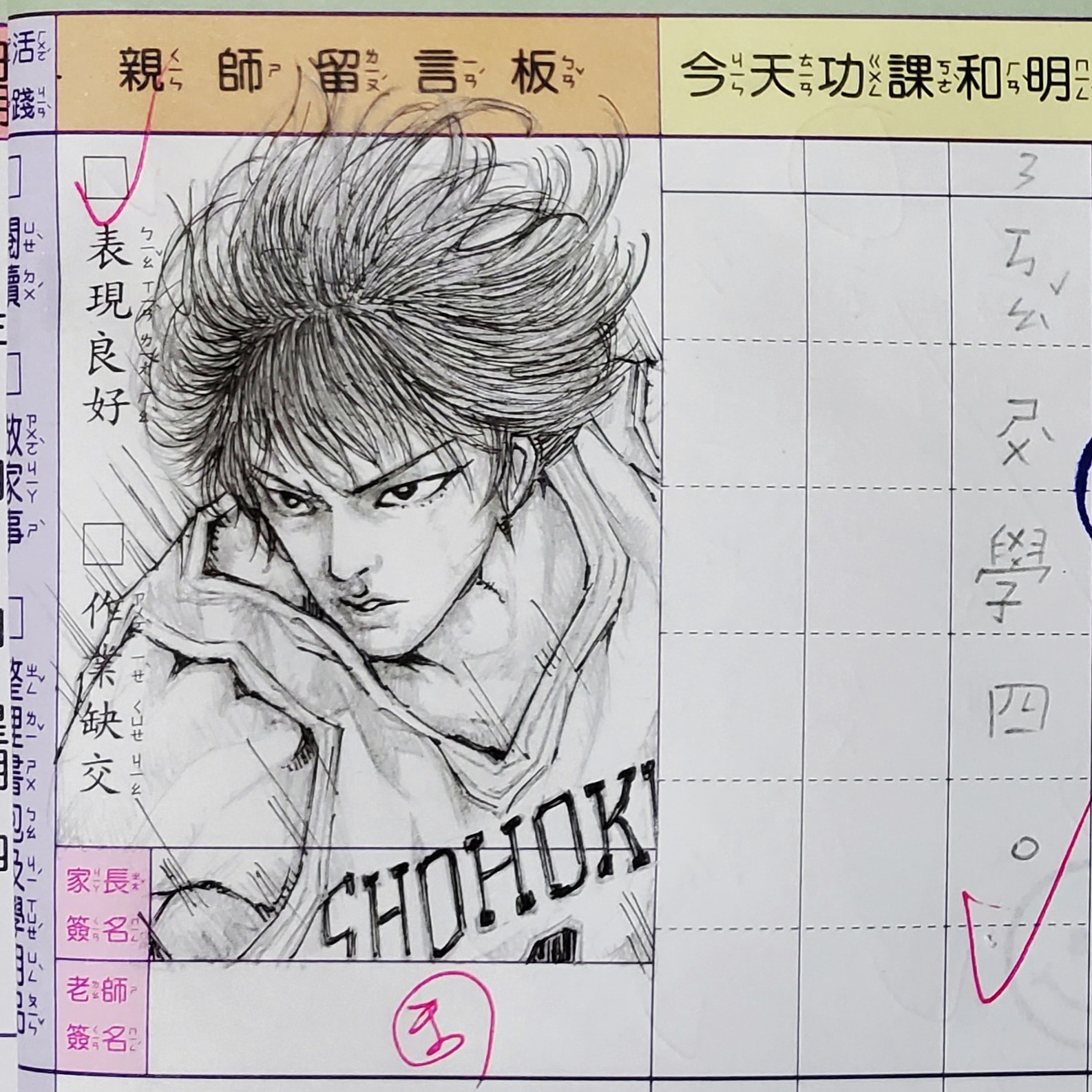 ▼原po分享6張照片,全都是聯絡簿上的畫作。他將親師留言版當成畫布,一天畫一個經典動漫《灌籃高手》中的角色,有櫻木花道: