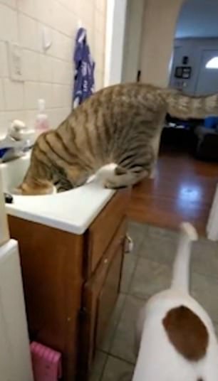 ▼只見Marvin迅速跳到洗手台上,假裝玩水。Louie在大狗狗的掩護下順利走進浴室,這有趣的一幕把主人逗笑了。