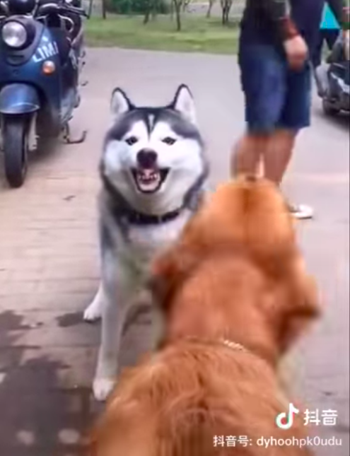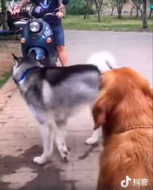 網友們看到這段影片紛紛笑說:「沒了靠山就沒辦法「唱秋」了XD」、「雖然很好笑,但還是要繫牽繩比較安全喔」、「沒主人撐腰瞬間弱掉」、「想不到黃金獵犬也會跟哈士奇吵」、「主、主人你怎麼走了…」。其實哈士奇和阿金都在虛張聲勢,根本沒想真的跟人家輸贏。好想知道牠們在吵什麼呀!