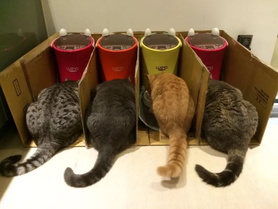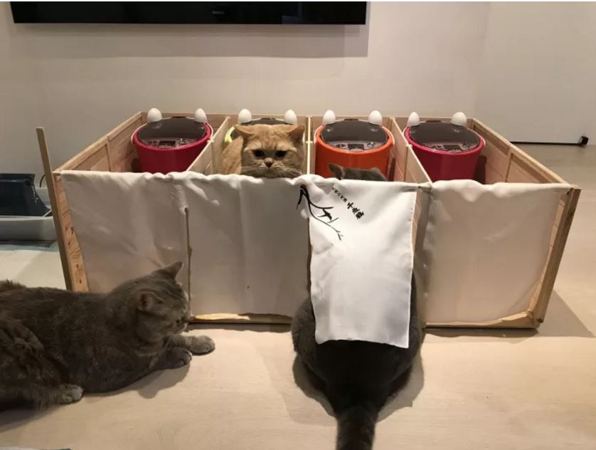 ▼為了維護喵界的和平,主人們先用紙板讓大家好好在自己的區域吃飯!看大家吃飯的屁屁真的太可愛了!