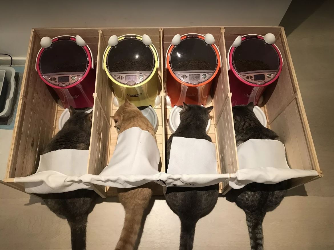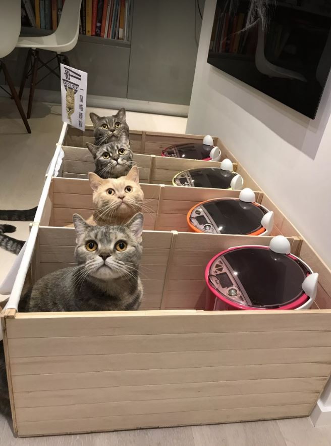 不過這樣的座位安排跟貓咪又有什麼關聯呢?原來是因為香港有一對飼主,養了四隻可愛的貓咪─貢丸、Mochi、Nugget 和 Pepper ,每次放飯的時候,佔有體型優勢的貓咪總是會迅速吃完自己的食物,去搶其他貓咪的食物。主人們為了讓每隻貓咪進食的份量都是一樣的,就想到隔開吃飯的空間,讓貓咪們都可以好好的享用自己的餐點。於是寵物的一蘭拉麵就此誕生了!