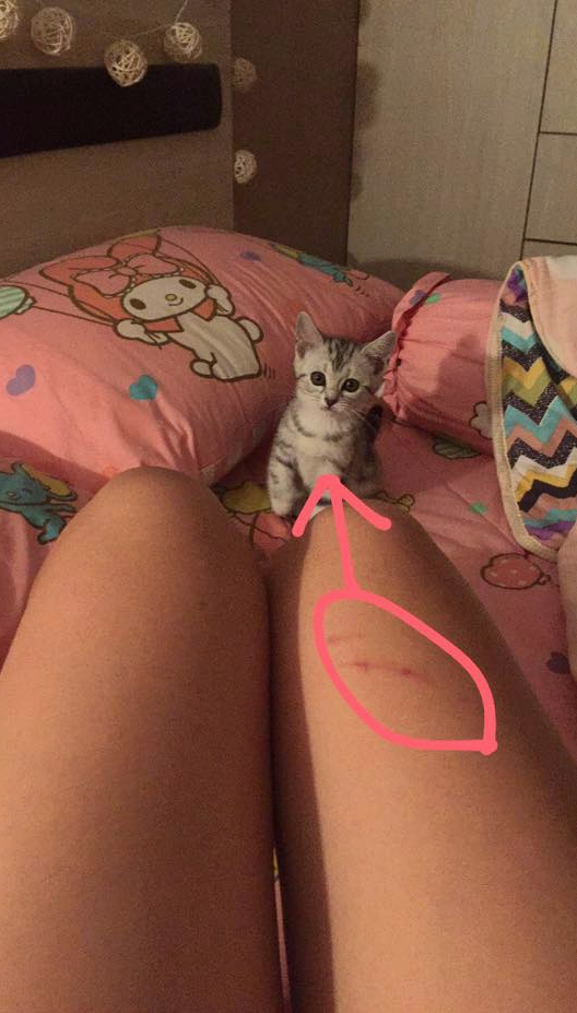 ▼之後網友又上傳了一張照片,是在她家裡的床上被這隻可愛的小貓抓到大腿的照片,看來她真的將小貓帶回家了呢!不過是老闆讓她帶回家幾天還是讓她飼養就不得而知了。