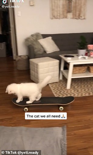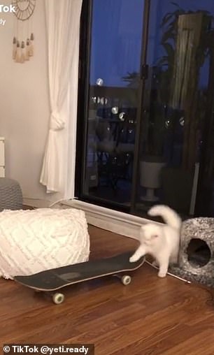 無師自通! 天才白喵「自學滑板絕技」 整天在家「嚕來嚕去」:懶得走路了啦~