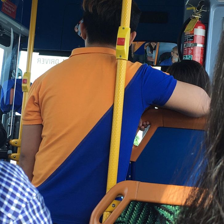 ▼4.這個男生的T恤和公車上的座位都融為一體了。