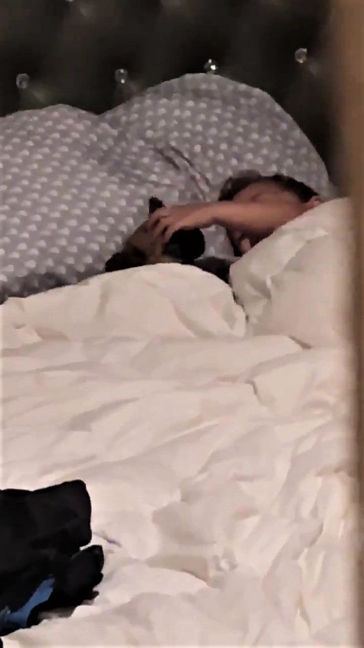 ▼再來看房內,只見小男孩和狗狗窩在床上,他先仰頭叫一聲,狗狗也跟著叫。