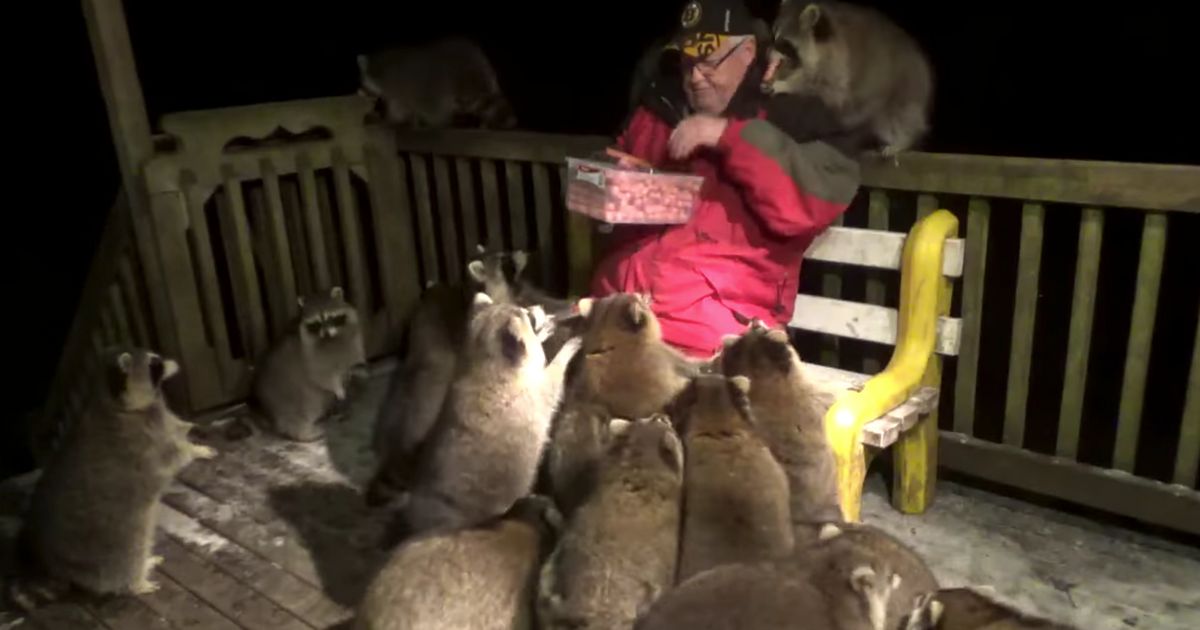 加拿大新斯科細亞省(Nova Scotia)有一名叫James Blackwood的退休警察,他經常在YouTube上分享「給浣熊餵食」的影片。在最近上傳的影片中,James被17隻浣熊包圍,就像被淹沒在浣熊堆裡一樣,那畫面非常有趣!