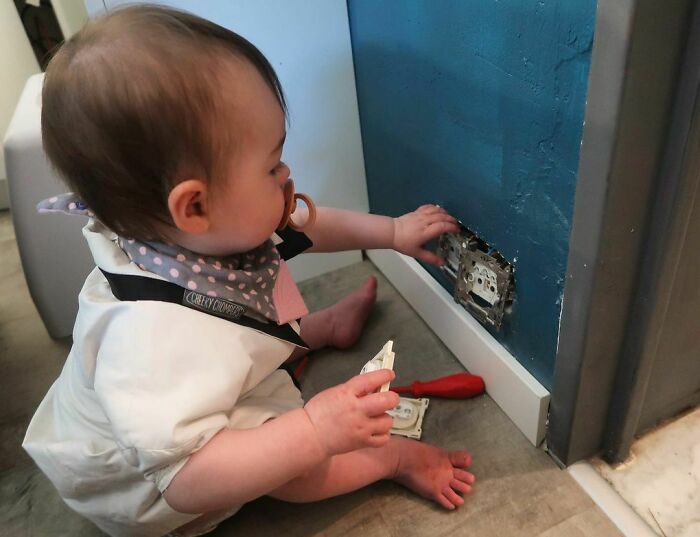 ▼Kenny說:「我們有了女兒後,我女友不得不回去上班。她一直讓我給她傳女兒的照片,以便她知道女兒是否安全。我決定幽默一點,於是製作了這一系列女兒處於險境狀況中的照片。」
