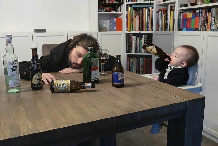 ▼Kenny製作的這些照片非常搞笑,女兒坐在懸崖邊、被塞進洗衣機裡、和爸爸一起喝酒、跟可怕的動物交朋友…這可能是很多媽媽對於另一半獨自照顧孩子時最可怕的想像了。