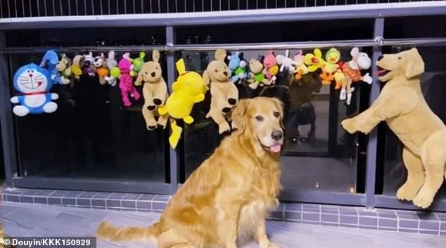 ▼從影片中可以看到,陽台上掛著大大小小十幾個絨毛玩偶,這都是Kang Kang的寶藏!牠坐在陽台上守護自己的寶貝,媽媽讓牠進來牠也不為所動。媽媽只能跟牠講道理:「快進來吧,玩具還沒有乾。」
