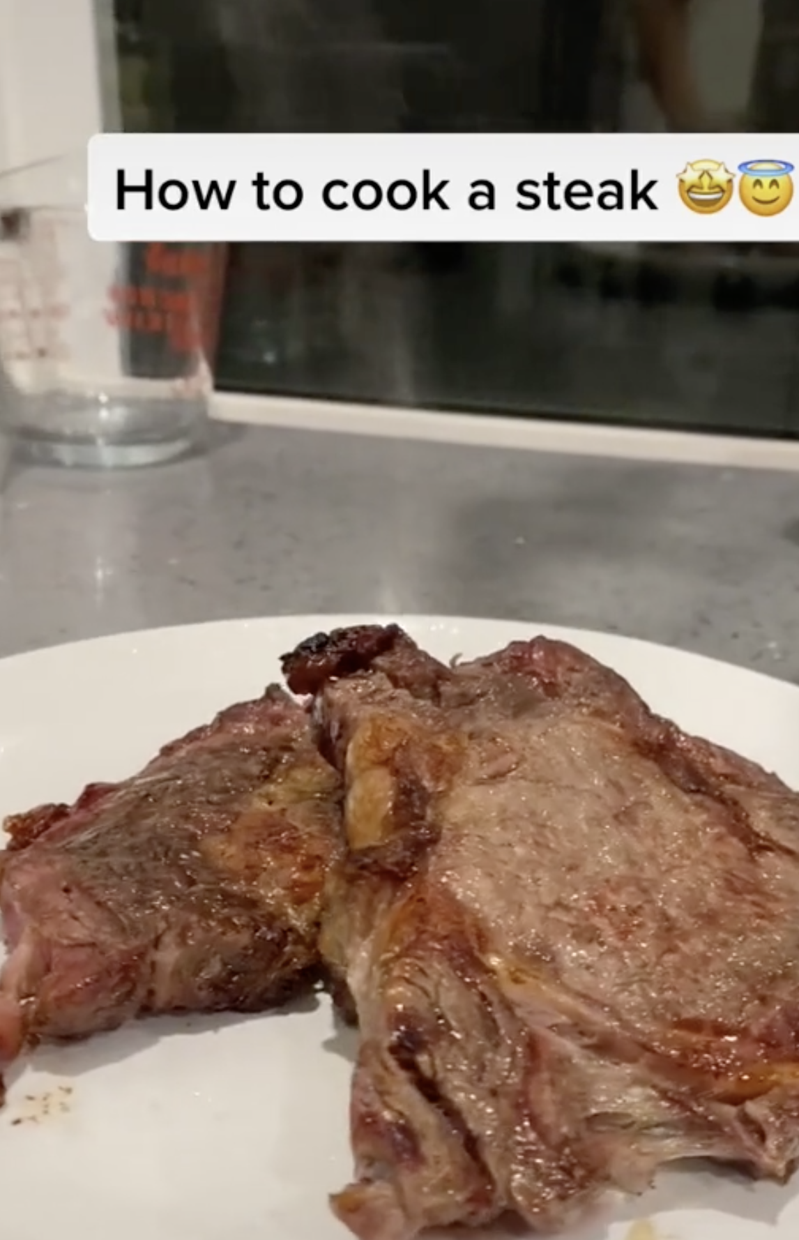 ▼在這段「為男友烤牛排」的影片中,Juliette將2片超厚的生牛排塞進吐司機的兩邊,然後調成中火按下開關。這樣來回烤了幾次後,牛排終於熟了。Juliette吃得津津有味,還在文末附上「主廚(chef)」的主題標籤。