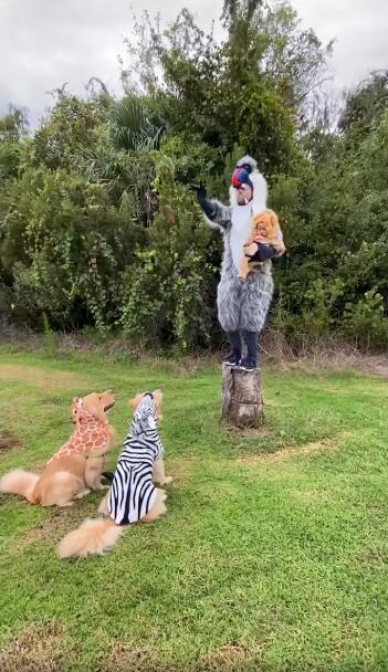 ▼從影片中可以看到,爸爸Jeremy cos電影中的狒狒巫師,將穿著小獅子裝的Malia高高舉起,接受動物們的朝拜。超配合的 Kenai 和Kono也盡職盡責地扮演著動物公民的角色,配上熟悉的音樂,簡直完美神還原!
