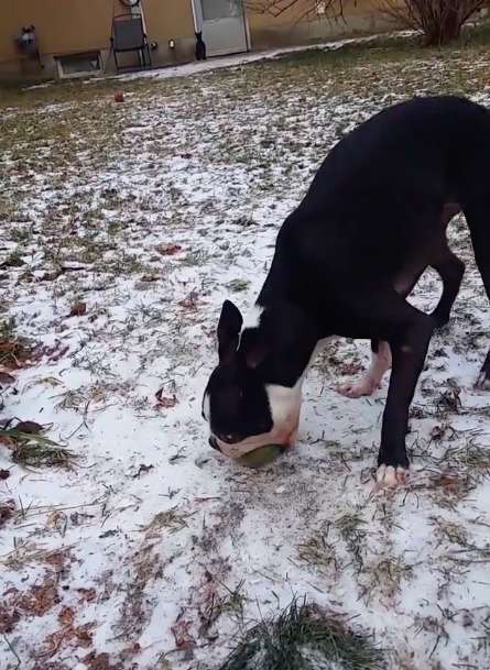 2020年11月21日很多狗狗都有心愛的玩具。加拿大薩克屯(Saskatoon)有一隻叫Manson的10歲大波士頓㹴。牠超喜歡玩球,主人給牠買了好幾顆網球,但牠對其中一顆情有獨鍾。一場降雪後,Manson心愛的那顆網球被凍在了地上。牠努力好久還是叼不起來,這下牠真的困惑了…