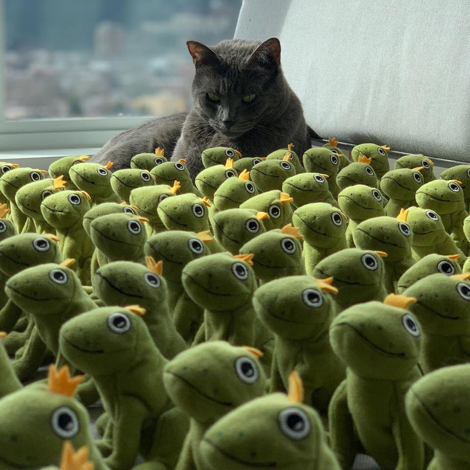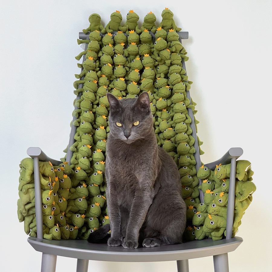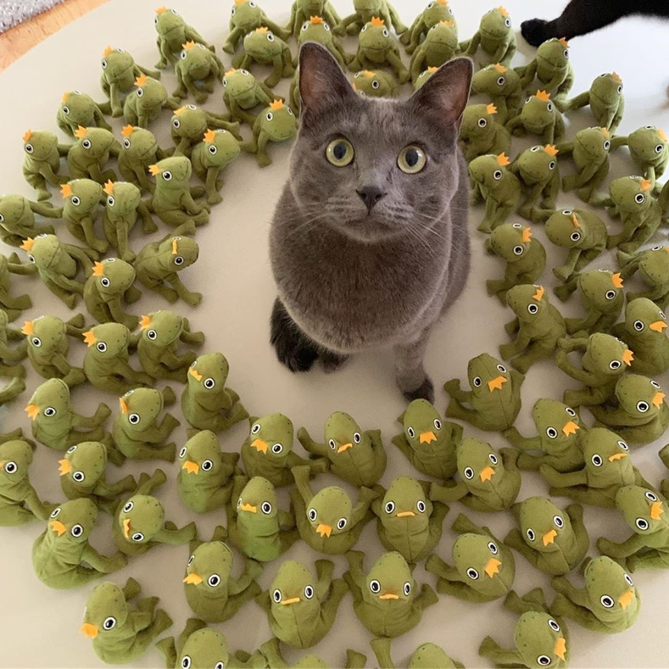 2020年11月22日只要有養過貓的人都知道,貓咪不僅非常冷傲、牠們的自尊心也是非常高的,最喜歡人類對牠們唯唯諾諾,因此才會有了「喵皇」這個霸氣的名稱!既然被稱為「喵皇」,想必牠們也很享受被許多崇拜的目光所環繞,美國有一位鏟屎官就為了滿足主子的虛榮心,為家中的喵皇添置了無數的「青蛙奴僕」,讓喵皇每天都能夠享受到最崇拜的目光!