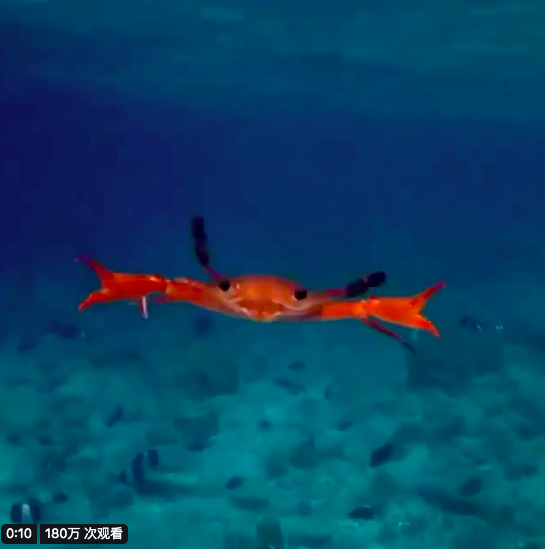 2020年11月22日螃蟹是一種很常見的海洋生物。我們從小就知道,螃蟹是橫著走路的,但牠們是怎樣游泳的呢?日本一名推主分享了一段螃蟹游泳的影片,短短1天時間點閱量就達到了76萬。大家紛紛表示:「太神奇了!」