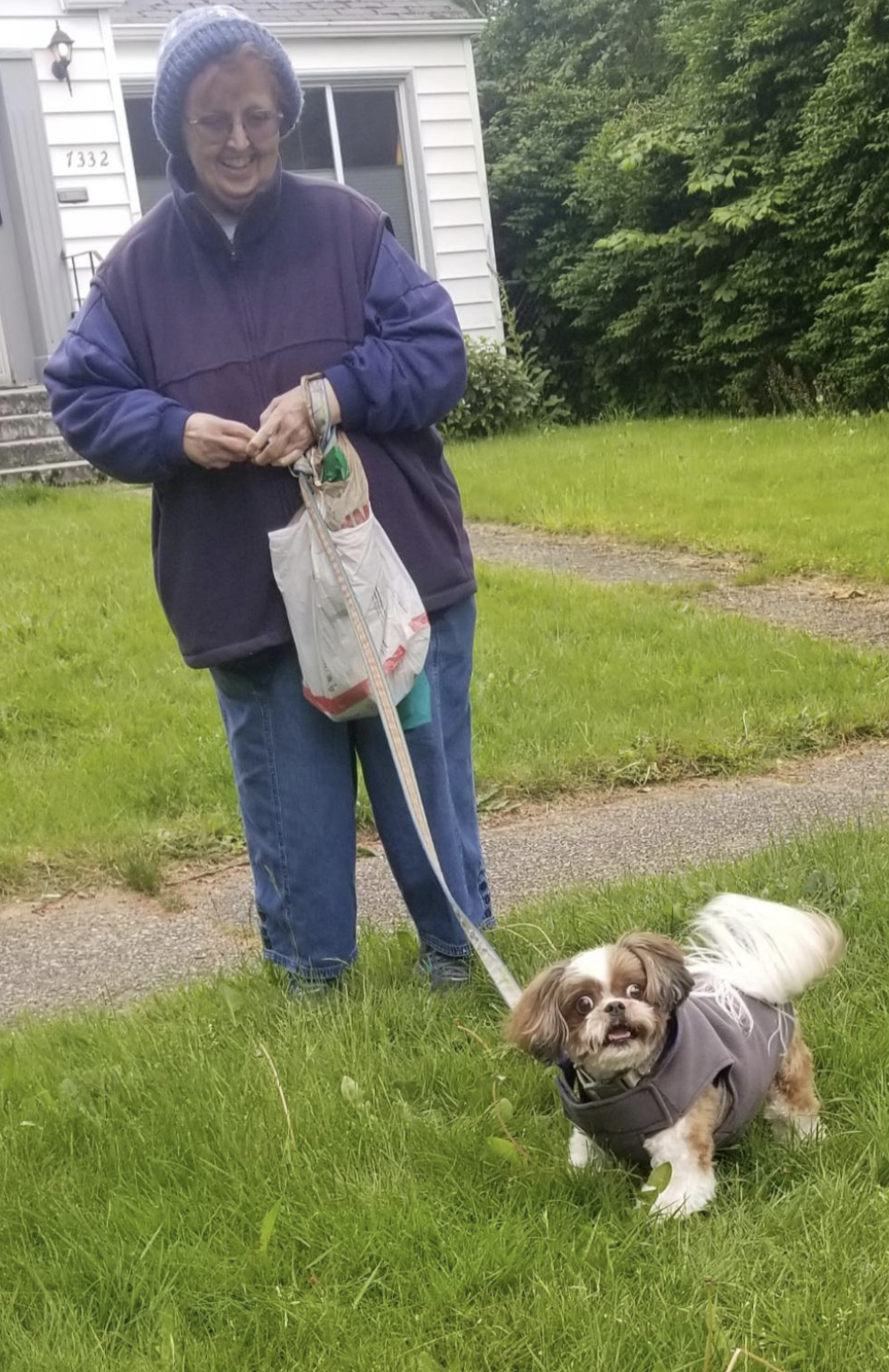 ▼照片中的西施犬穿著厚實的衣服,主人正牽著牠在草叢裡散步。牠轉頭看向左側時,發現美容師竟站在旁邊,嚇得瞪大眼睛、嘴巴張開,整隻狗愣在原地,那劇烈的反應超可愛。
