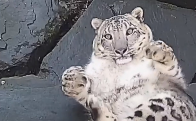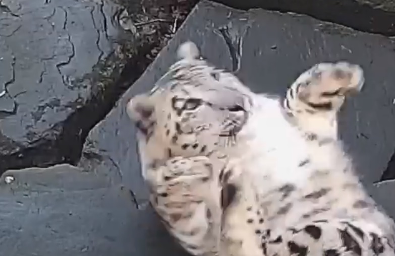 嚇到本豹了!肥美雪豹見相機「驚到翻身」 肉肉狂抖翻不回來:偶投降~