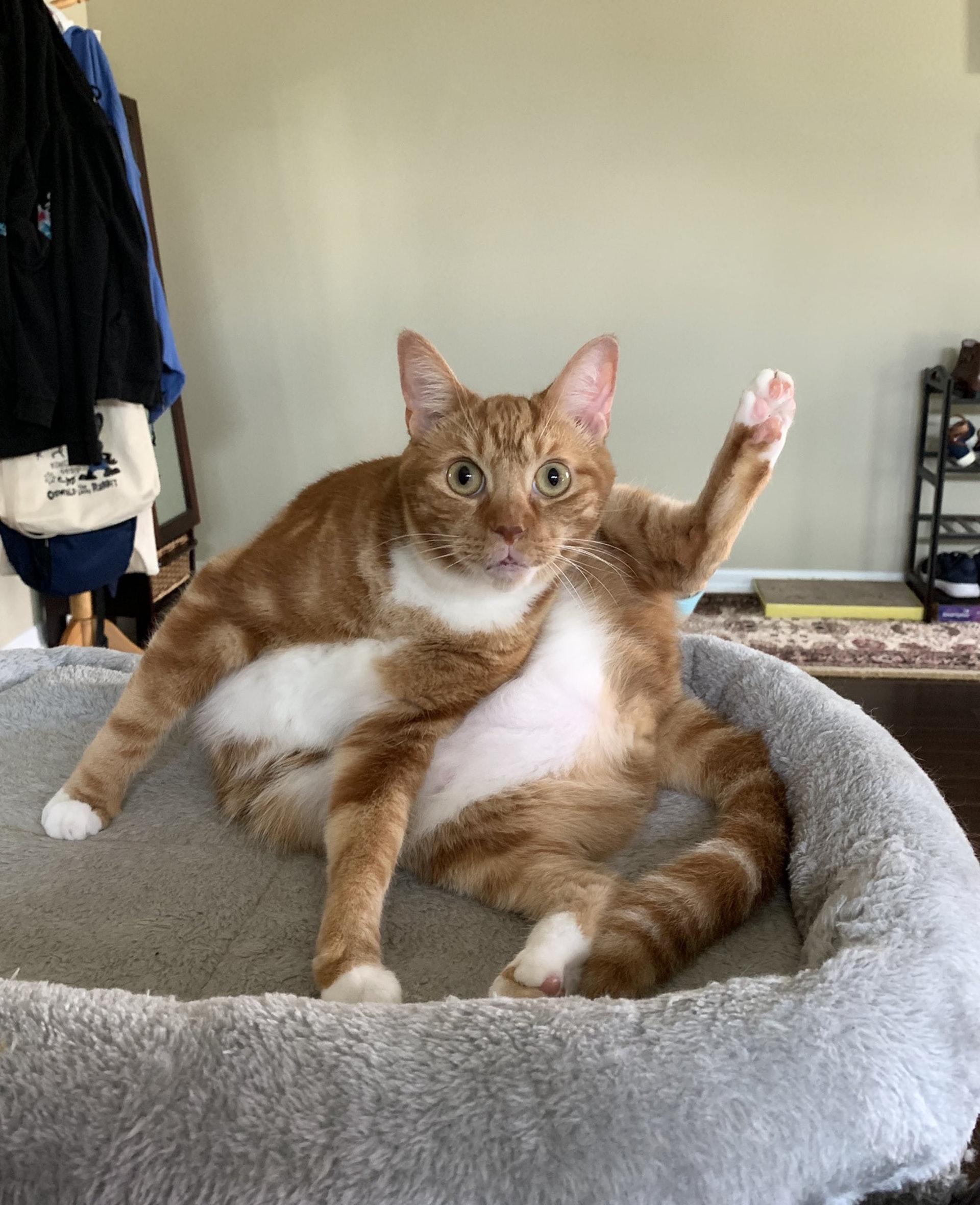 ▼原來貓咪正準備舔後腳毛。牠的體型很對得起自己的毛色,肚子上的肥肉非常柔軟。牠努力抬起後腳,正準備忘情舔毛,結果被突然冒出來的主人打斷,整隻貓咪愣在原地。