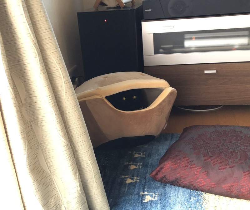 ▼將抱枕帶回家後,剛開始貓咪充滿戒心,雖然非常好奇,但不願意鑽進去。
