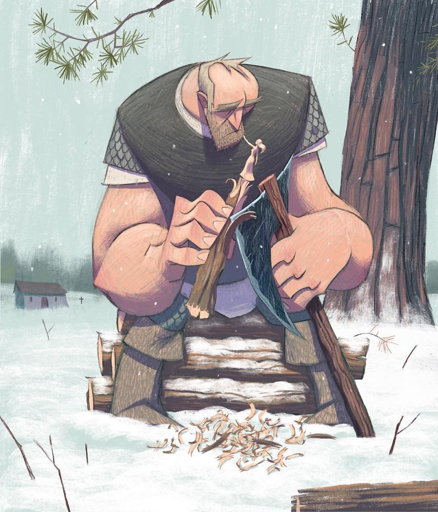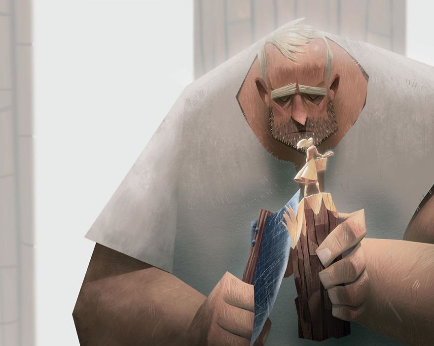 ▼這一系列插畫很有創意,粗獷的木匠與柔美的木雕女孩形成鮮明的對比。木匠把自己對愛人的思念、柔情全部投注到木雕中,最後他終於把愛人抱在了懷裡。