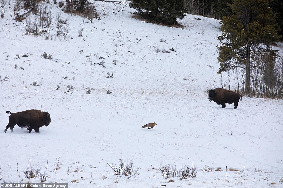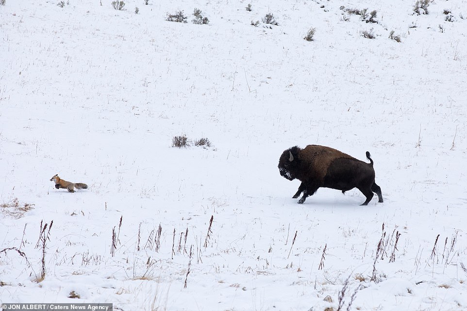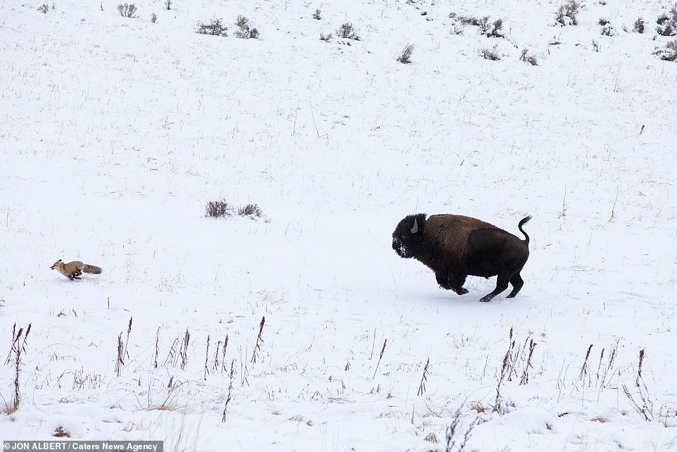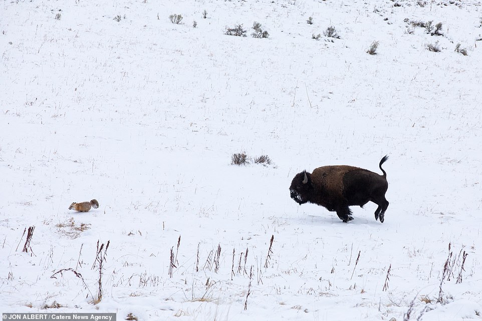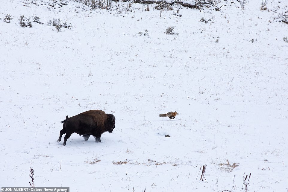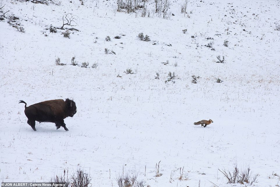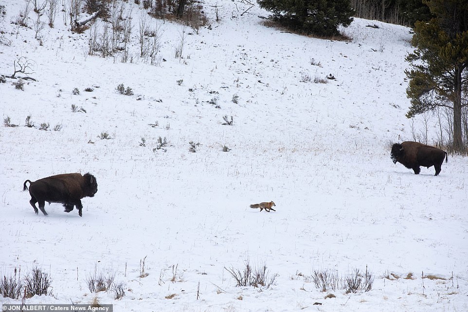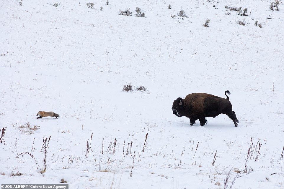 ▼家住黃石國家公園附近的44歲男子Jon Albert拍到了這罕見的互動。他說:「野牛似乎心情很好,看到小狐狸後就跑去追牠。牠們是在娛樂、嬉戲,狐狸知道這一點,所以沒有逃開,一直在這一區域跑。野牛每次看到牠都會跑去追,牠們就這樣追追停停了10分鐘。」