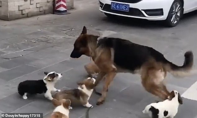 ▼德國牧羊犬被柯基犬寶寶「包圍」: