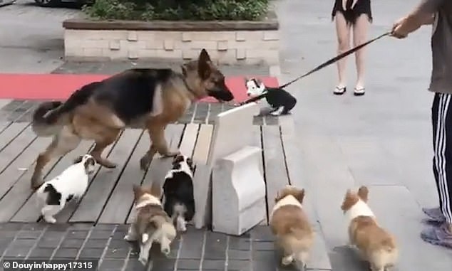 救救偶!德牧散步被「迷你柯基幫」一湧而上 甩不掉好慌:現在怎麼辦QQ