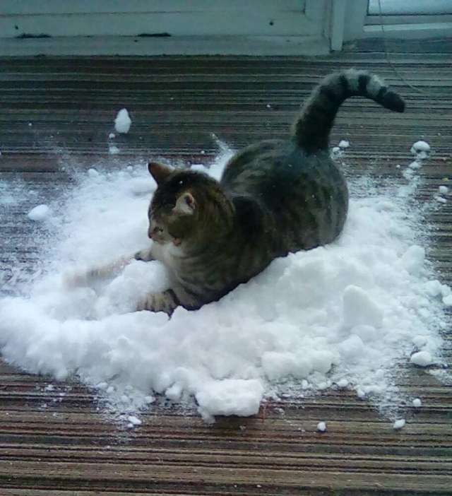 ▼為了保證Dibs的安全,Troy希望牠能在室內玩耍。但室內沒有雪,這該怎麼辦呢?寵愛Dibs的Troy直接將一堆雪放到走廊上,讓貓咪玩個夠。