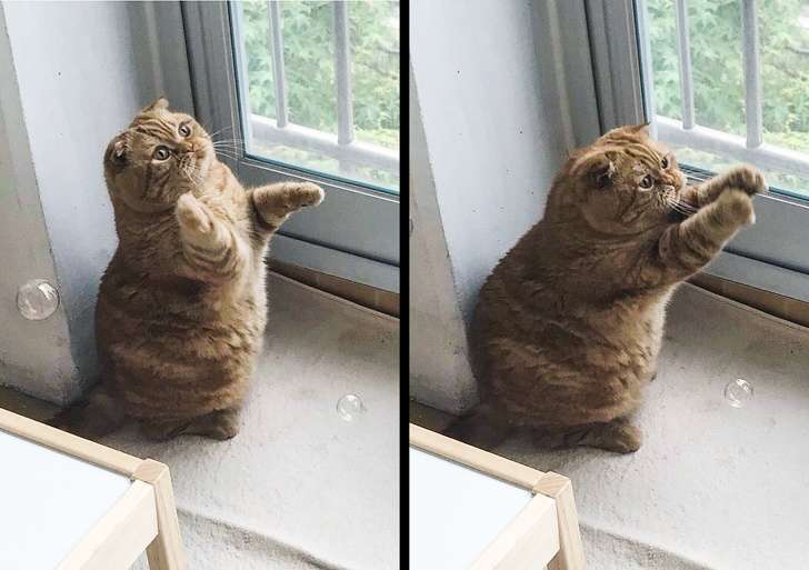 ▼胖喵追泡泡。