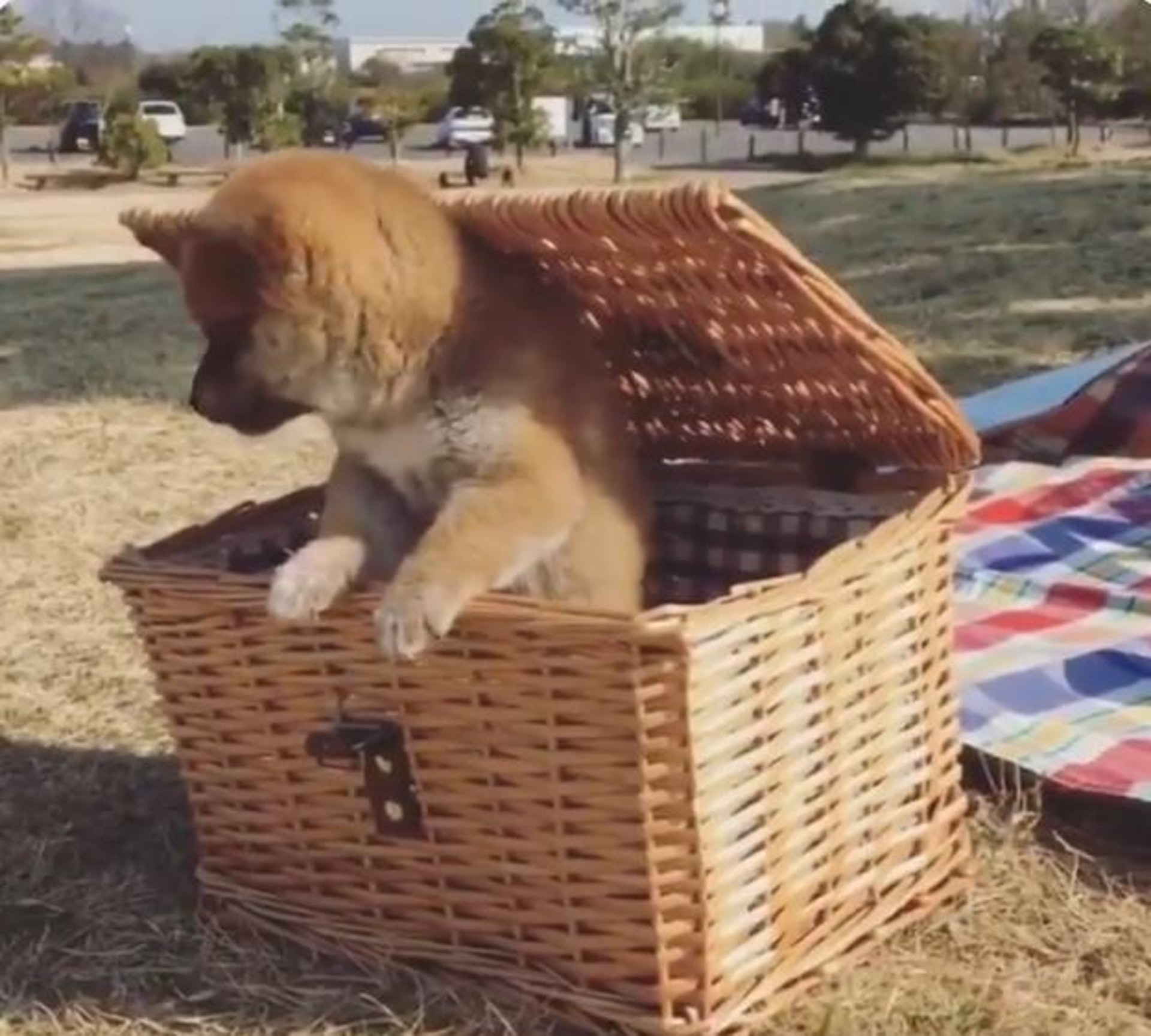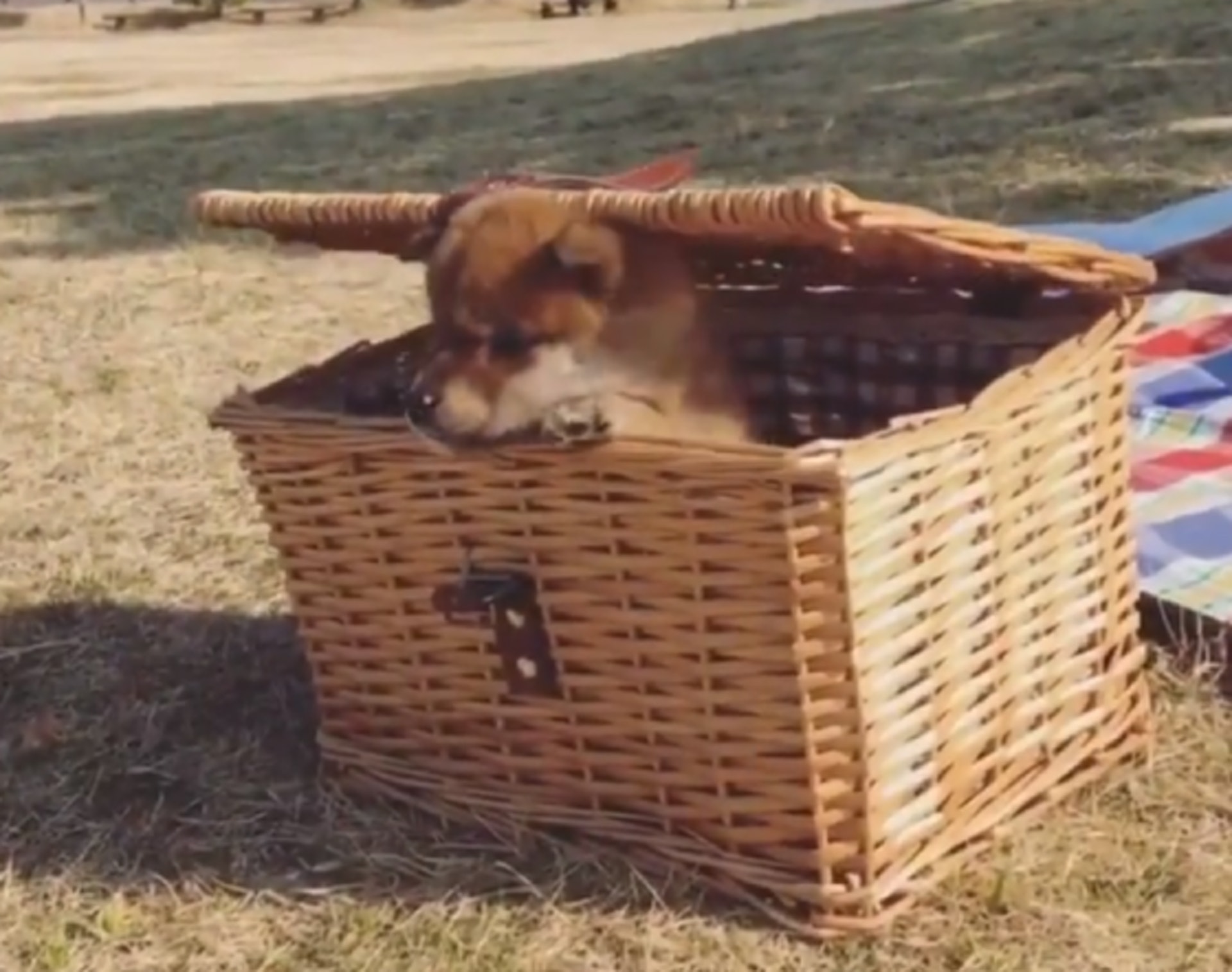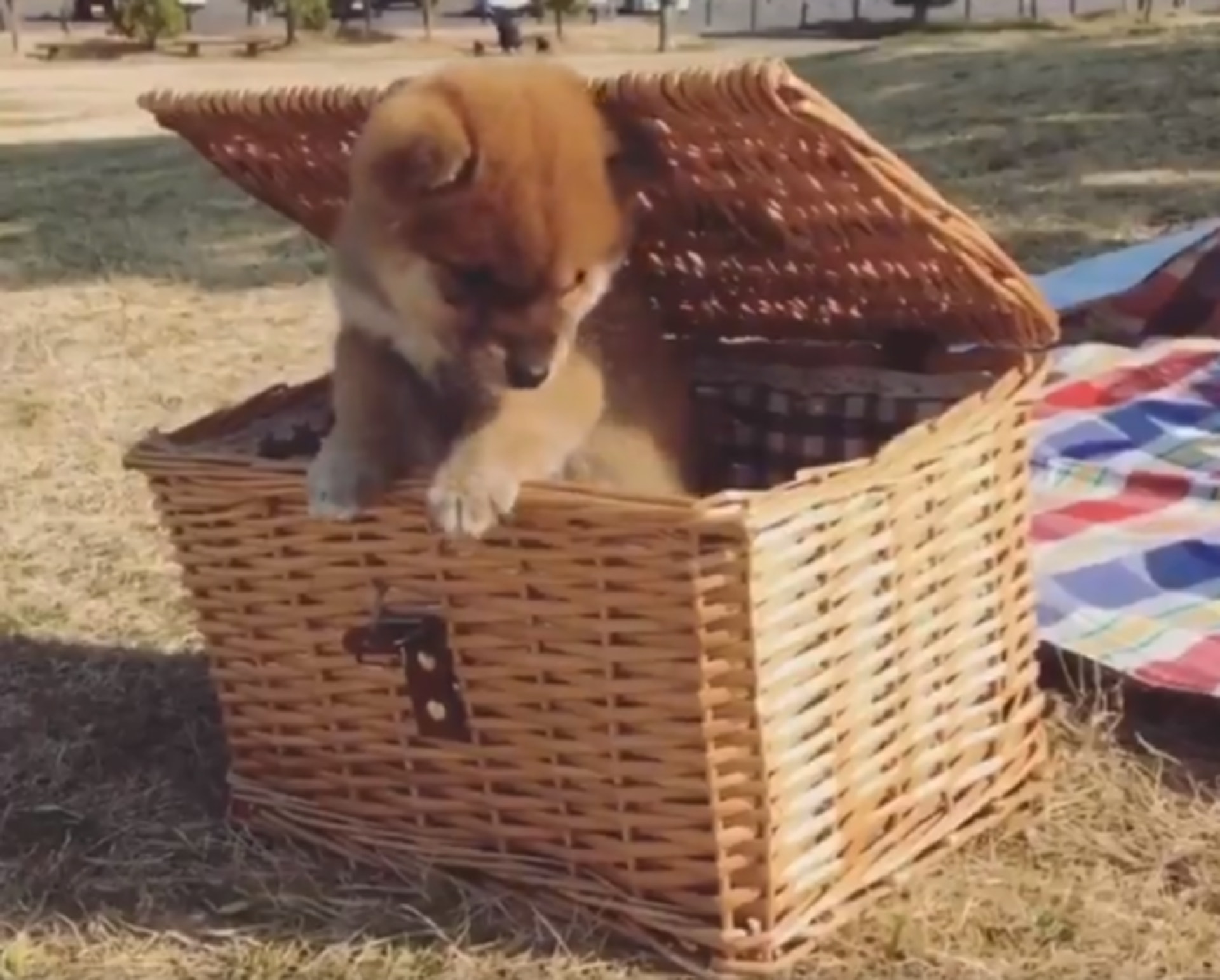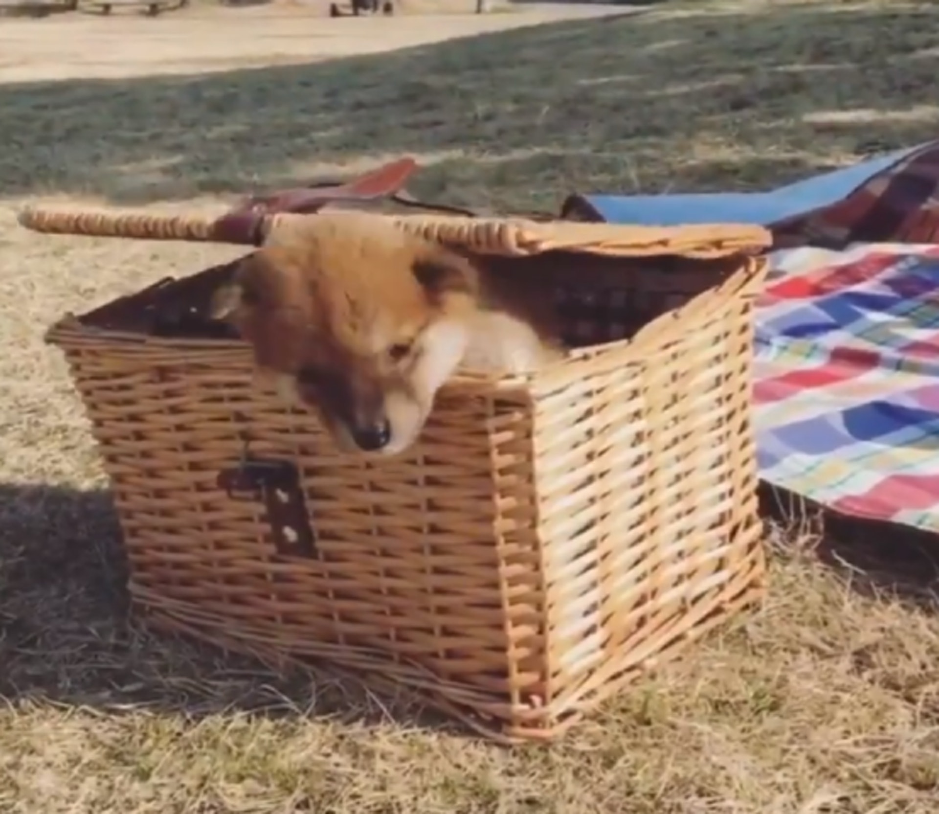 呆萌小柴第一次野餐「看見外面世界」 從籃子探頭又躲回去:好可怕!