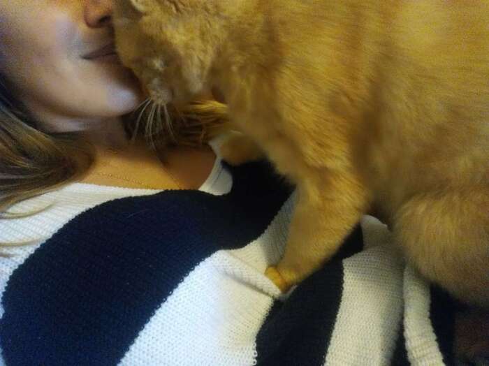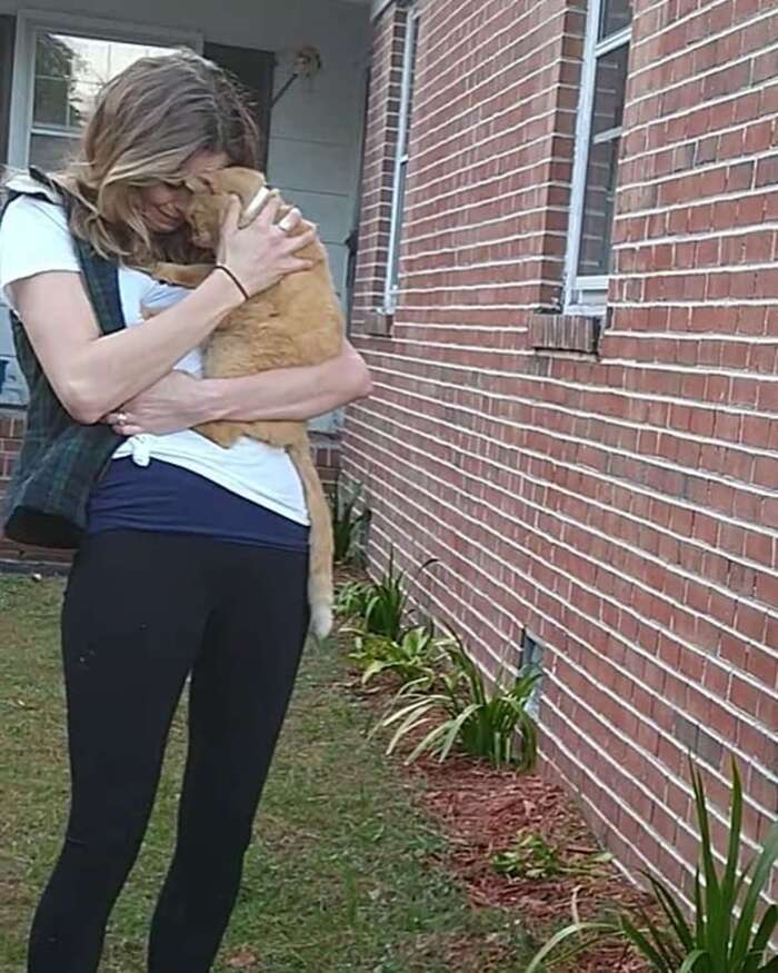 ▼Mindy立刻跟那名男子聯繫,到目的地時看到貓咪正坐在庭院裡吃零食。Mindy說:「我坐在台階上等牠接近我,以防牠害怕,但是牠直接跳到了我的腿上,還發出呼嚕聲。我老公跟那個好心人聊天的時候,貓咪發出了我從未聽過的大大呼嚕聲,還把頭靠在我懷裡,磨蹭了好長時間。那一刻我覺得內心的裂痕癒合了。」