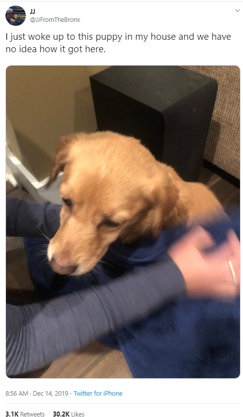 2020年12月18日命中注定是你家的毛孩~有一天凌晨4點,國外網友Jack Jokinen被妻子叫醒。他家有一個剛剛1月大的寶寶,Jack本以為孩子怎麼了,沒想到妻子卻說:「寶寶很好,但……我們家多了一隻狗!」當時Jack睡得迷迷糊糊,一時之間弄不清楚妻子的意思,他決定下樓看一看。