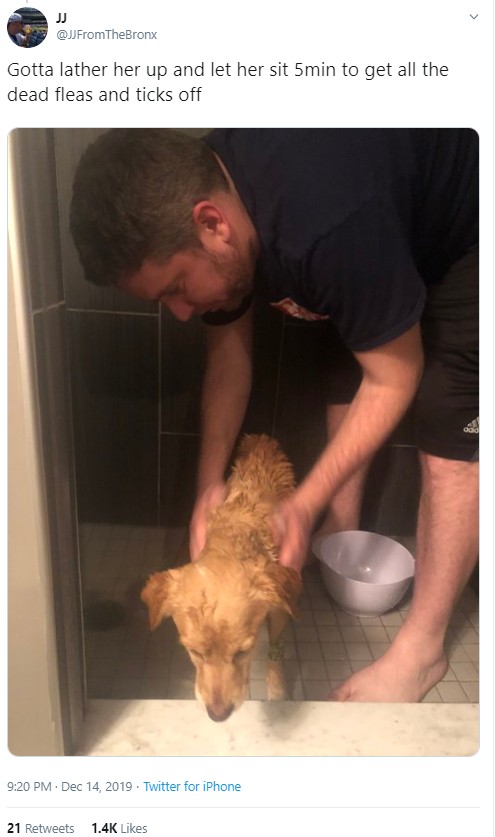 ▼Jack和妻子給狗狗擦乾身體,他們本想將狗狗送到動物收容所,又有點不捨。因為那隻狗狗非常憔悴,牠體型瘦小,只依靠三條腿走路,身上全是跳蚤,牙齒的情況也很糟糕。Jack決定帶狗狗去看獸醫,沒想到獸醫檢查後告訴他,這隻瘦弱的狗狗已經九歲了!