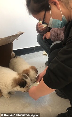 ▼考試結束後,老師給小狗們準備水和食物,讓牠們吃飽喝足。另一位愛狗的老師收養了牠們,這兩隻可愛的狗狗終於有家了。