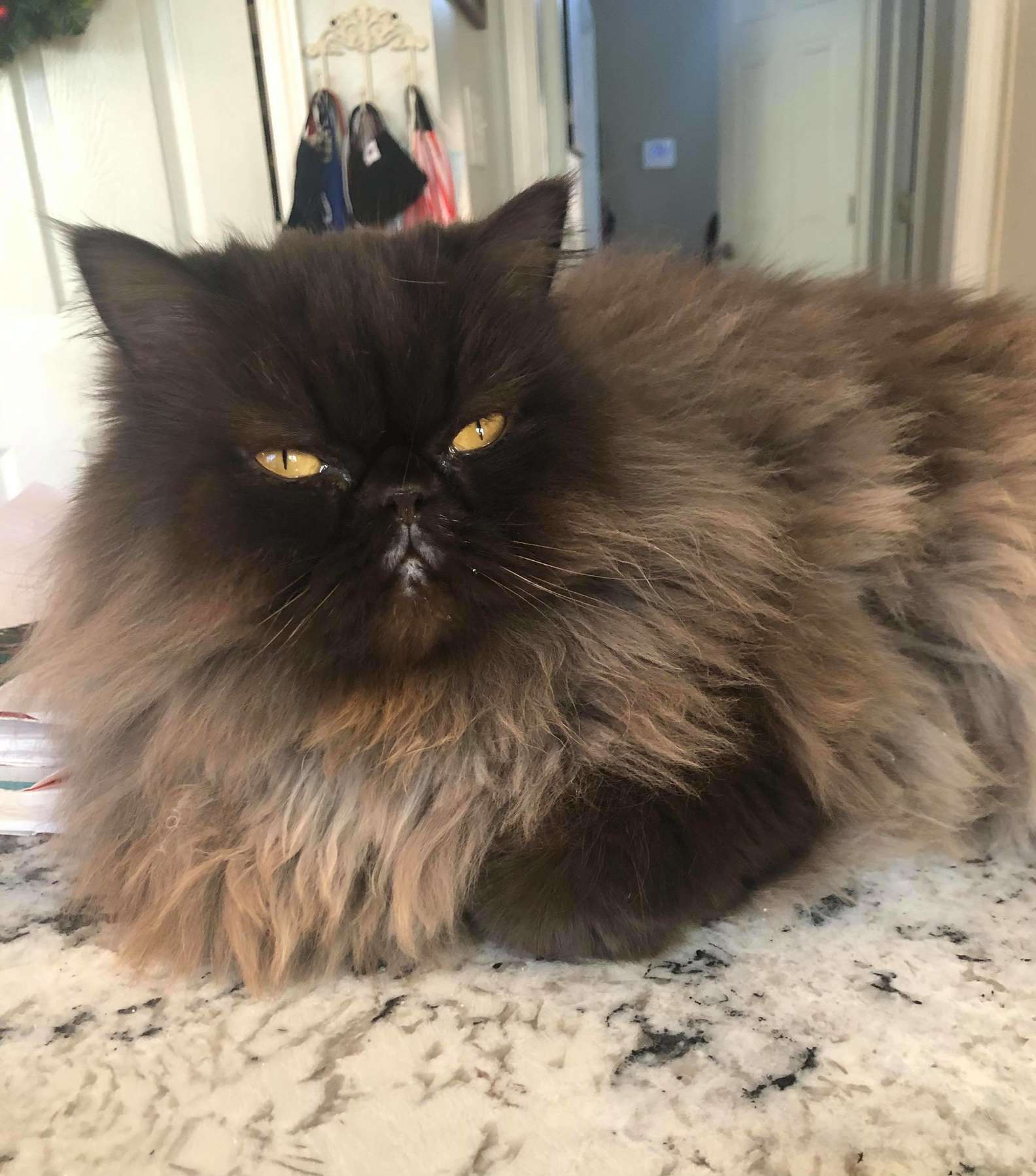 ▼Murphy穿過廚房時,Farrah看到牠的後腳紅紅的,當下有點擔心。等牠轉過臉來,Farrah才發現牠嘴巴周圍的毛毛全都塗滿了口紅。Murphy不覺得自己做錯事,因為地上的東西本來就屬於牠!Farrah無奈說:「只要掉到地上的東西,Murphy就覺得是吃的。之前牠吃過口香糖,還咬過我兒子的牙套。」