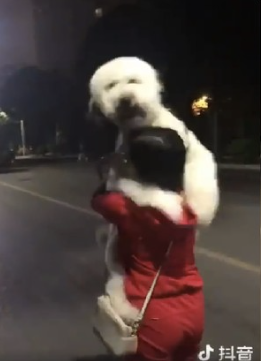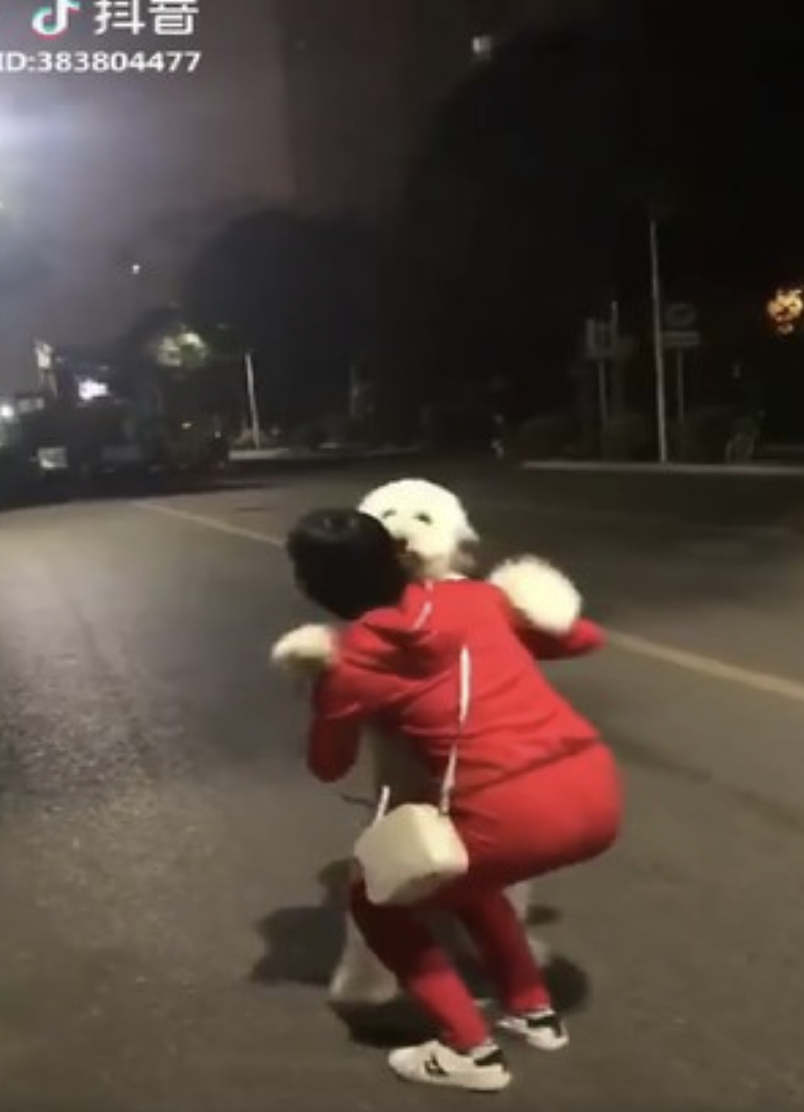 ▼當時馬麻帶著狗狗在夜間散步,狗狗興奮地跑了一大圈,突然撲到馬麻面前,雙腳站起來討抱抱。牠身體站直,張開兩手,馬麻跟牠配合得非常好,立刻上去抱住牠的身體。狗狗目的達到,露出開心的表情,臉上的笑容很燦爛。馬麻抱著大狗狗往前走的畫面看起來非常萌。