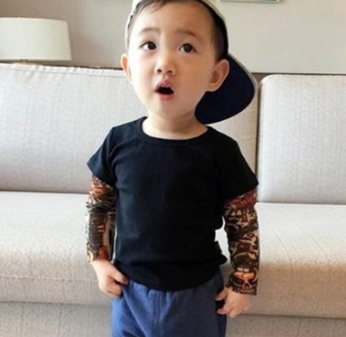 ▼這件連體衣看起來很普通,但袖子的部分卻是刺身袖套。小寶寶穿上後,雙臂佈滿「刺青」,很有氣勢。連體衣是純棉的,袖子則是95%聚脂纖維+5%萊卡,柔軟又透氣,還有防曬的作用,小寶寶穿起來很舒服。