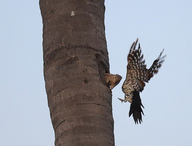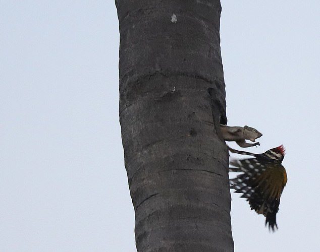 ▼啄木鳥被嚇到,連忙飛走去尋找其他目標。牠明明看到樹洞裡有松鼠在休息,還執著地啄樹幹,難怪松鼠會生氣。