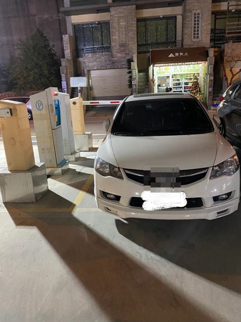 ▼從照片中可以看到,一輛白色Honda大剌剌停在停車場出入口,後面就是柵欄。這輛車將出口完全擋住,其他的車沒辦法出去。原po說,因為這台車擋住出口,有3輛車出不去。白色Honda內沒有留電話,其他車主只好報警,最後才聯絡到車主的丈夫。
