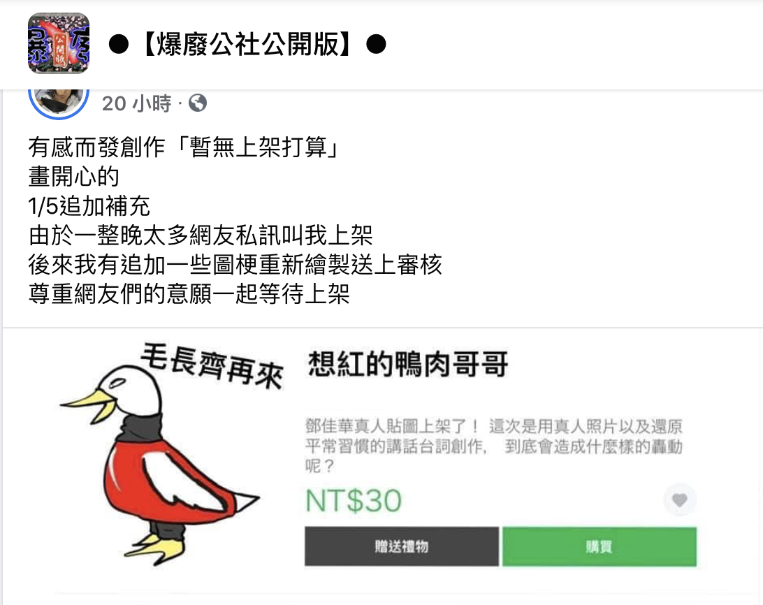 ▼設計師沈培安根據這件事創作了一系列貼圖。他將這些作品po到臉書社團「爆廢公社公開版」上,本來沒想上架,只是單純跟網友們分享,沒想到超受歡迎。大家紛紛催促他上架,他為了回應大家的熱情,已經向LINE官方提出申請了。