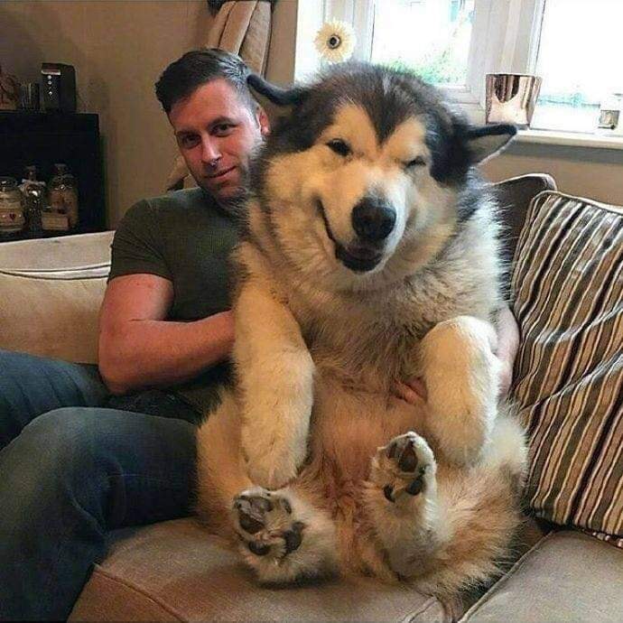 ▼大狗狗雖然體型誇張,但非常可愛,也很親人。狗狗胖成球,還要趴進主人懷裡撒嬌,主人感覺壓力好大。從側面看,主人幾乎消失不見啦~