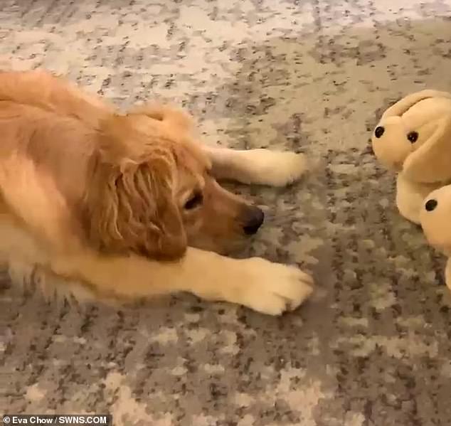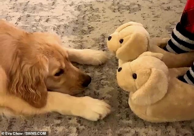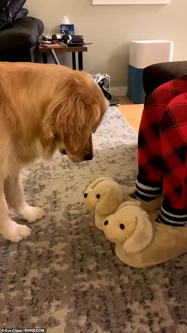 2021年01月10日家裡突然來了新的狗狗~美國西雅圖女網友Eva Chow養了一隻叫Molly的2歲金金。因為家中有狗狗,所以Eva也特別喜歡狗狗元素的小物。那天她買了一雙狗狗造型的拖鞋,Molly看到後瞬間懵了。牠傻傻看了好幾秒,好像在想:「主人養了新的小狗狗嗎?」