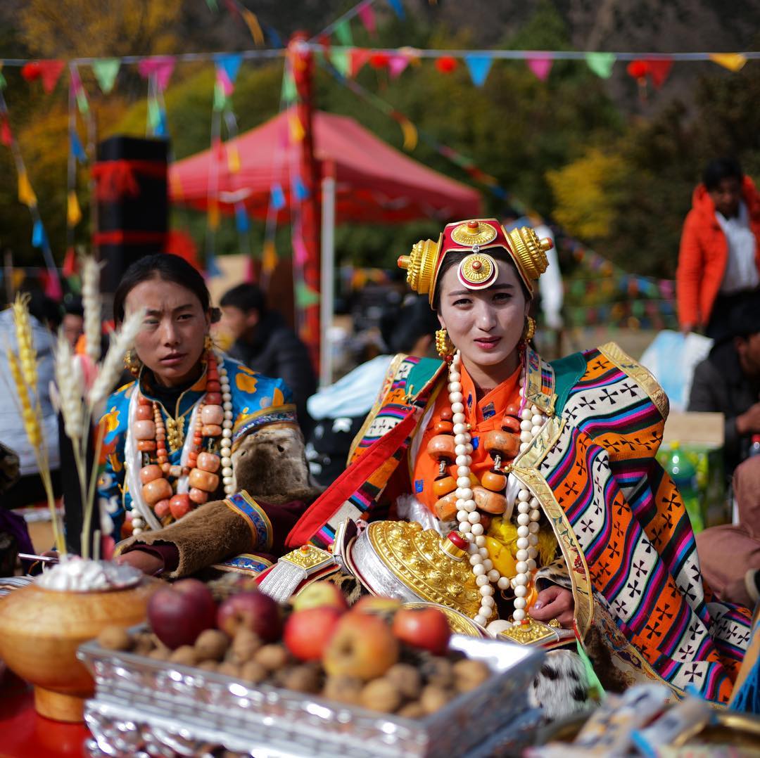 ▼西藏:新郎為新娘準備婚紗和飾品,飾品包括頭飾、辮子上的小裝飾,或帶有佛像的護身符。
