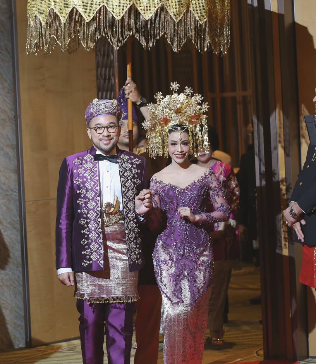 ▼雅加達:新娘戴著複雜奢華的金色頭飾,禮服色彩鮮豔,非常隆重。