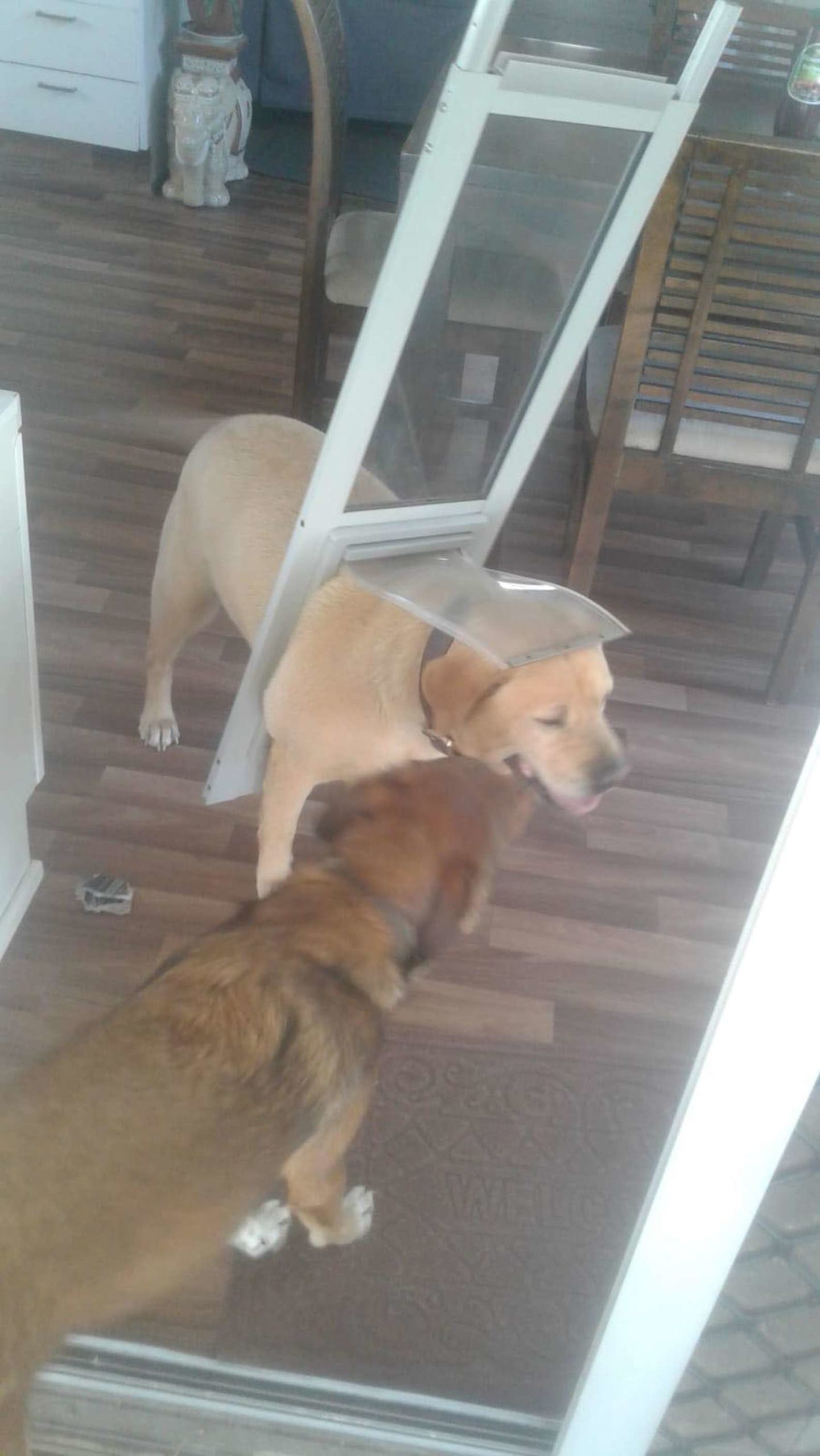 ▼Drax似乎沒有意識到自己長胖了,回到熟悉的環境後,牠還跟以前一樣開開心心、跑來跑去。有一天牠準備和其他狗狗一起出去玩耍,經過狗門時不小心被卡住。牠不知道自己比剛開始胖了很多,被卡住後還努力想掙脫,甚至將整扇狗門都拆了下來。