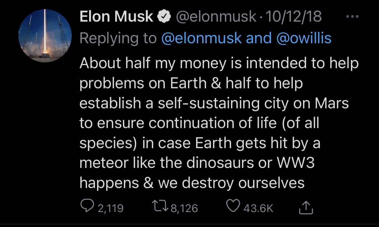 ▼馬斯克剛剛成為全球首富時,他就在推特上將2018年時的一則推文置頂。這則推文表示,他會拿出半數財富,以確保所有物種延續。