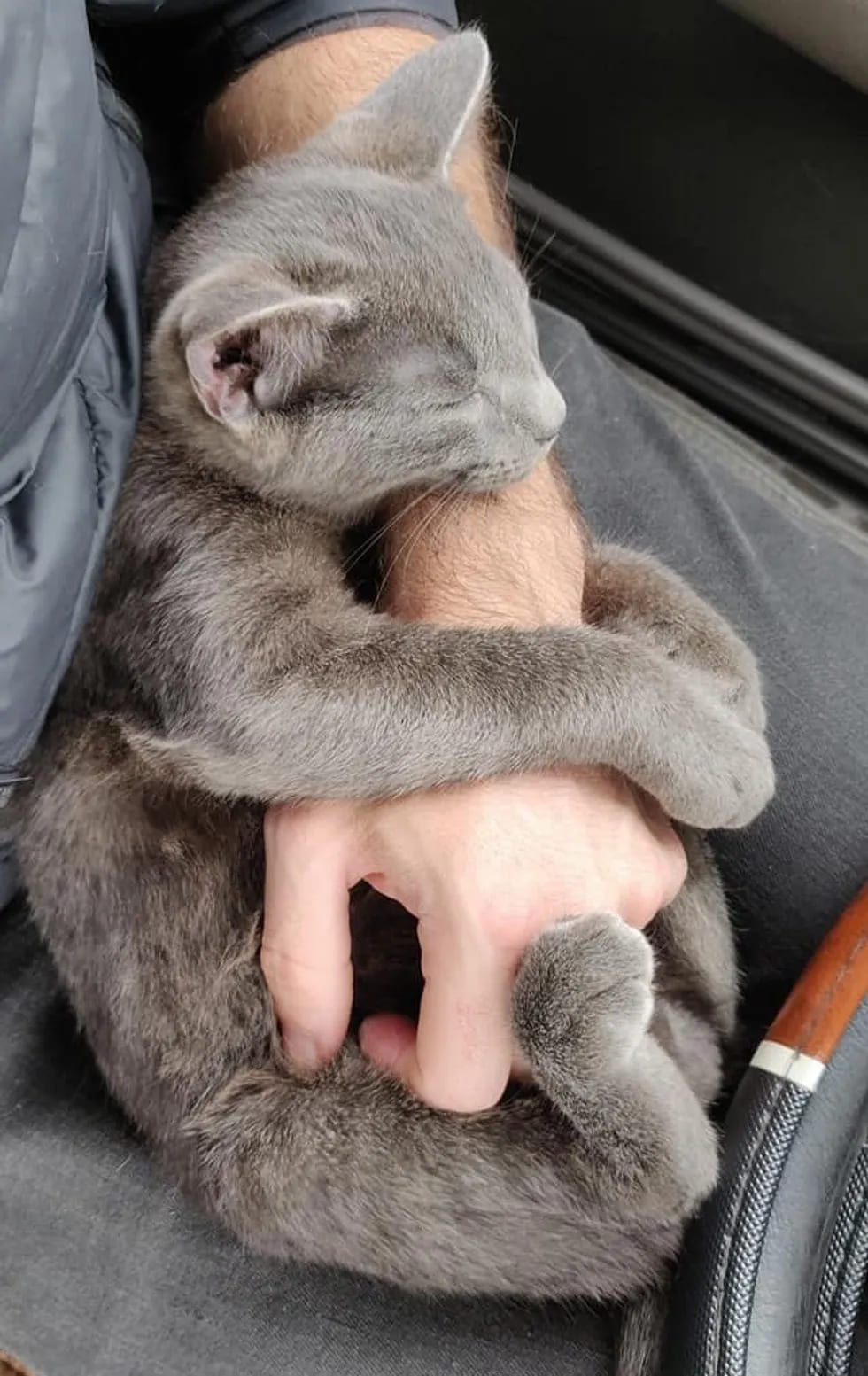▼貓咪一路對著Jason大叫,Jason也捨不得這隻黏人的小貓,就把牠撈上車,並抱在懷裡。回家途中,貓咪緊緊抱著Jason的手臂,好像怕他會不要自己。那一幕太溫情,Jason的心都要融化了。