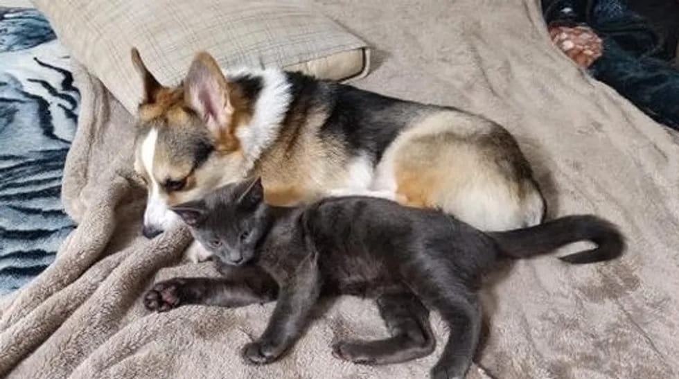 ▼Jason給貓咪取名為Popeye,回家後給牠找了一些東西吃,並把牠介紹給愛犬。他本以為貓咪和狗狗要熟悉一段時間才能成為朋友,沒想到牠們很快就相處融洽,還抱在一起入睡,就像一對老朋友一般。