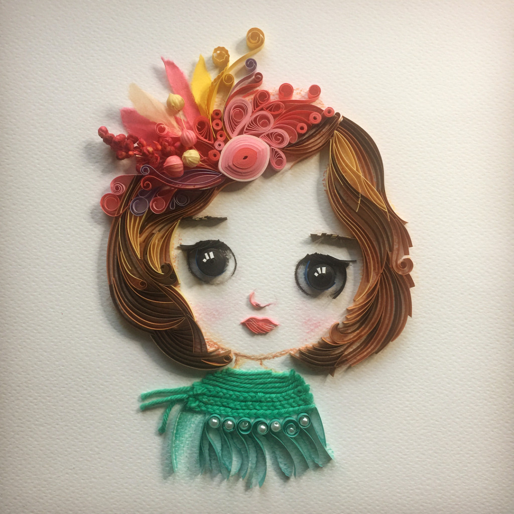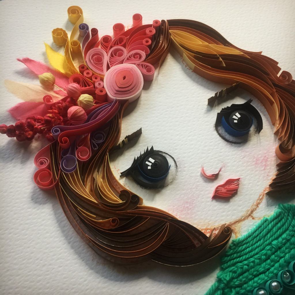 ▼近照可以發現,這幅「畫」,是用捲紙構成之外,透過不同的間隔大小,來做出髮絲與頭飾,在衣服上還選用了異材質來做搭配,毛線的出現彷彿真的穿上了件衣服呢!